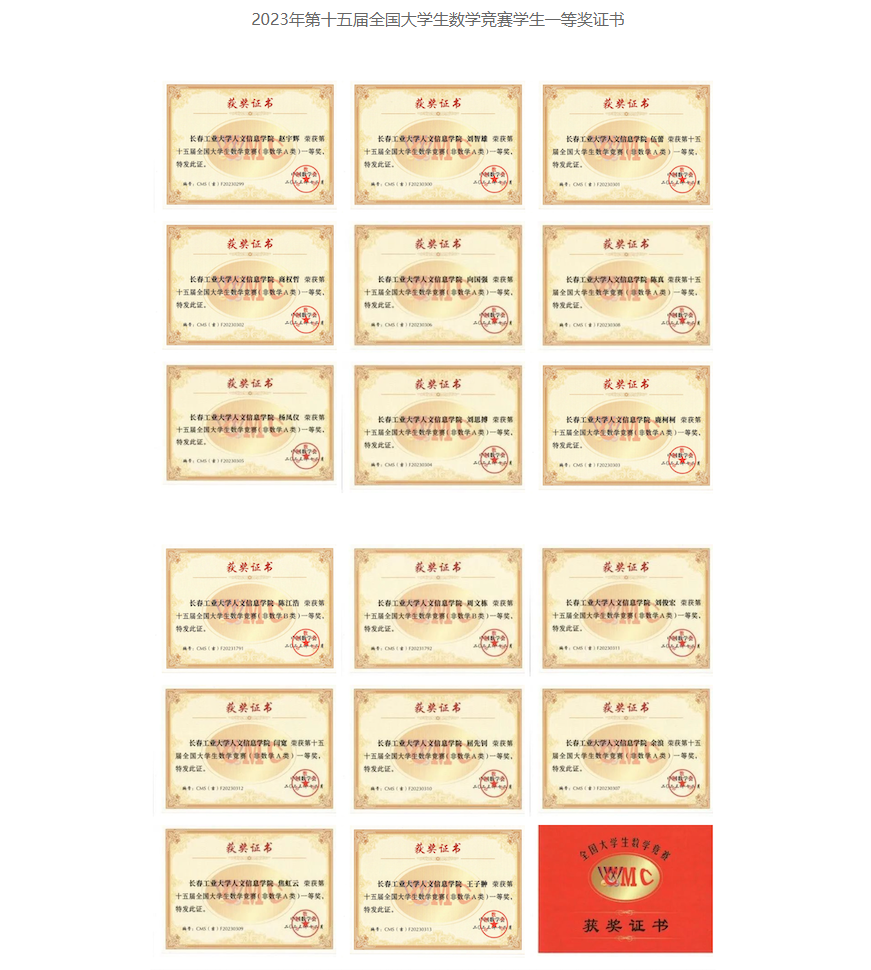 在全国第十五届大学生数学竞赛中我校有210名同学报名参赛,其中73位同学分别获得全国大学生数学竞赛非数学专业组(A,B类)一等奖17人、二等奖25人、三等奖31人;62名同学获得2023年吉林省大学生数学竞赛三等奖;并且张育梅老师指导的赵宇辉同学最终入选全国总决赛(吉林省30名),取得了历史性的突破。指导教师张育梅、王家强、历天宝获得优秀指导教师奖。