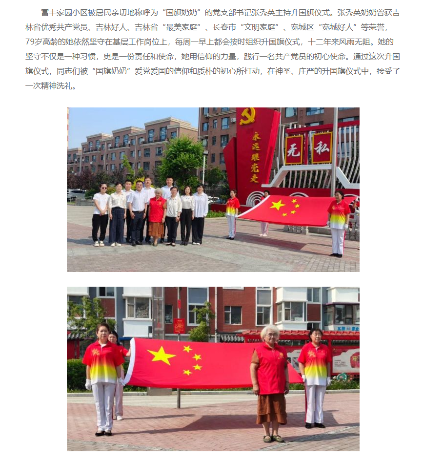 为庆祝中国共产党成立103周年,7月1日早 8 点,建设工程学院师生党员代表赴长春市宽城区富丰家园小区,参加“国旗奶奶”张秀英主持的“红心向党·薪火相传”升国旗仪式。学校党委组织部部长王春玲,长春市吉美社会组织发展服务中心、民盟宽城区委及长春市宽城区柳影街道富丰路社区代表,共同参加本次活动。 中国教育在线对我校党员参加吉林好人“国旗奶奶”张秀英组织的升国旗仪式进行媒体报道