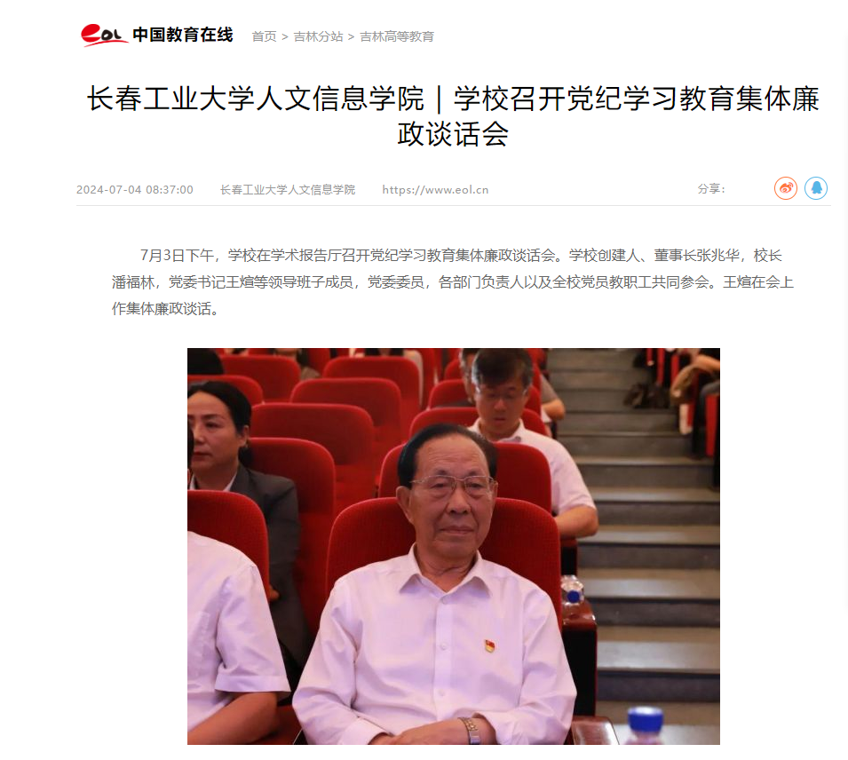 中国教育在线对我校召开党纪学习教育集体廉政谈话会进行了报道。