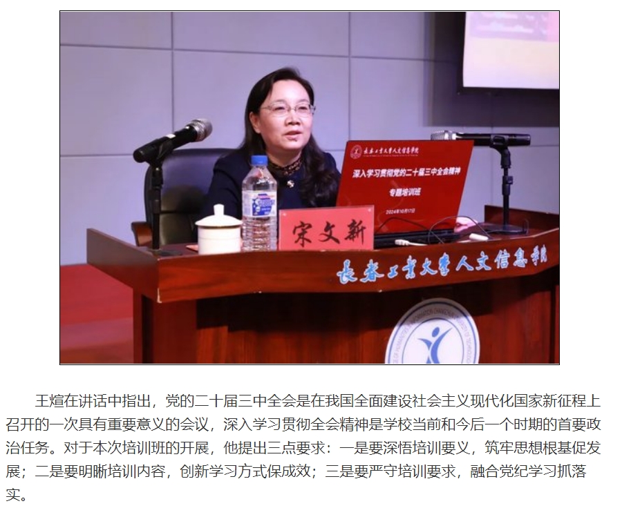 根据吉林省委教育工委下发的《关于做好全省民办高校深入开展党的二十届三中全会精神教育培训工作的通知》要求,按照学校深入学习贯彻党的二十届三中全会精神专题培训班的工作安排,10月17日,学校举办深入学习贯彻党的二十届三中全会精神专题培训班开班仪式。学校创建人、董事长张兆华,校长潘福林,党委书记王煊,纪委书记张哲人,副校长李晓科,校长助理王爽及全校教职工参会。中共吉林省委党校副校长宋文新作专题辅导报告,王煊作开班动员讲话。会议由党委组织部、党委宣传部、党委统战部部长王春玲主持。