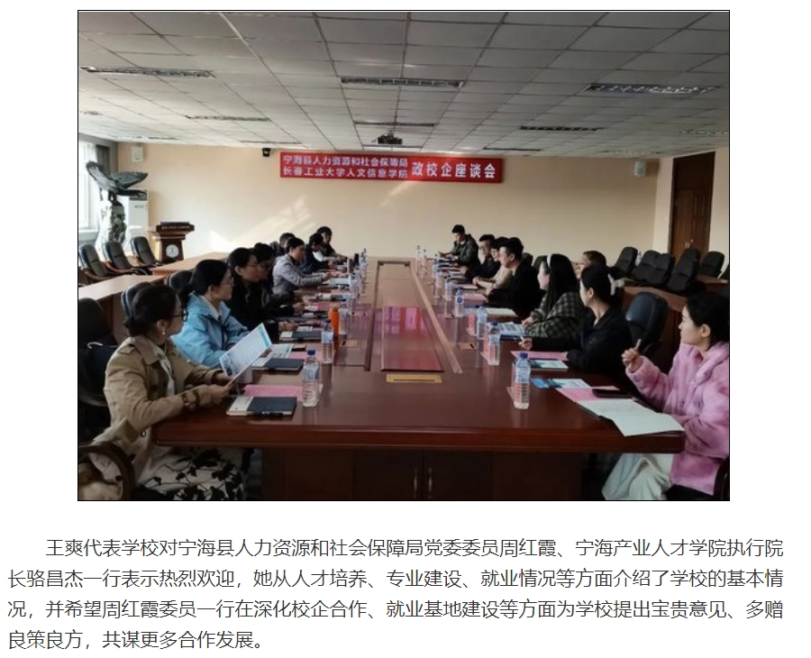 10月23日,宁海县人力资源和社会保障局领导带领部分企业代表到长春工业大学人文信息学院开展政校企座谈会。学校相关学院党总支书记、辅导员及招生就业处人员参加会议,校长助理王爽出席会议并讲话。