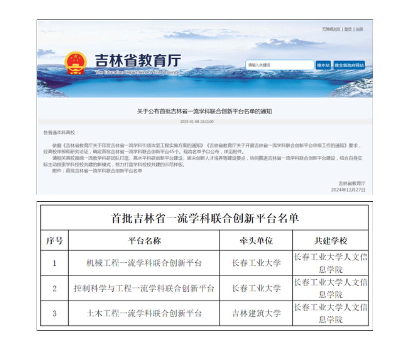 1月8日,吉林省教育厅正式发布了《关于公布首批吉林省一流学科联合创新平台名单的通知》,全省共有45个一流学科联合创新平台脱颖而出。长春工业大学人文信息学院表现突出,成功获批三个平台,分别为长春工业大学人文信息学院与长春工业大学联合共建的机械工程一流学科联合创新平台、控制科学与工程一流学科联合创新平台,以及与吉林建筑大学联合共建的土木工程一流学科创新平台。