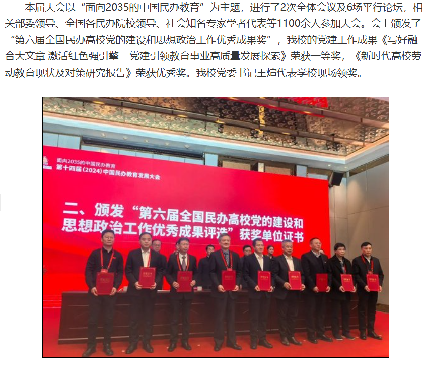 1月11日至12日,第十四届(2024)中国民办教育发展大会在北京举办,大会深入学习贯彻全国教育大会精神,研讨民办教育发展趋势、高质量发展战略与可持续发展路径,搭建交流合作平台,服务教育强国建设。我校党委书记王煊代表学校应邀参加大会,学校两项成果荣获“第六届全国民办高校党的建设和思想政治工作优秀成果奖”。