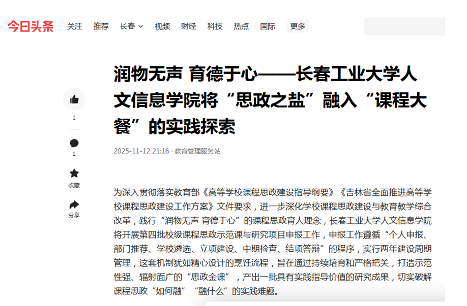 近日,中国日报网等媒体以《润物无声 育德于心——长春工业大学人文信息学院将“思政之盐”融入“课程大餐”的实践探索》为题,深度报道了我校课程思政建设与教育教学综合改革工作,特别聚焦了学校课程思政建设系统化的顶层设计和持续深化的建设机制,以及学校让思政教育如盐溶水般自然融入专业教学的特色做法。