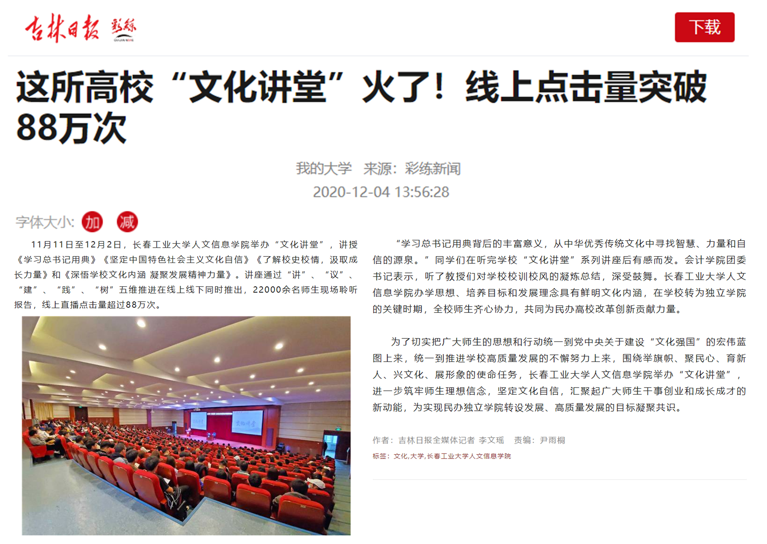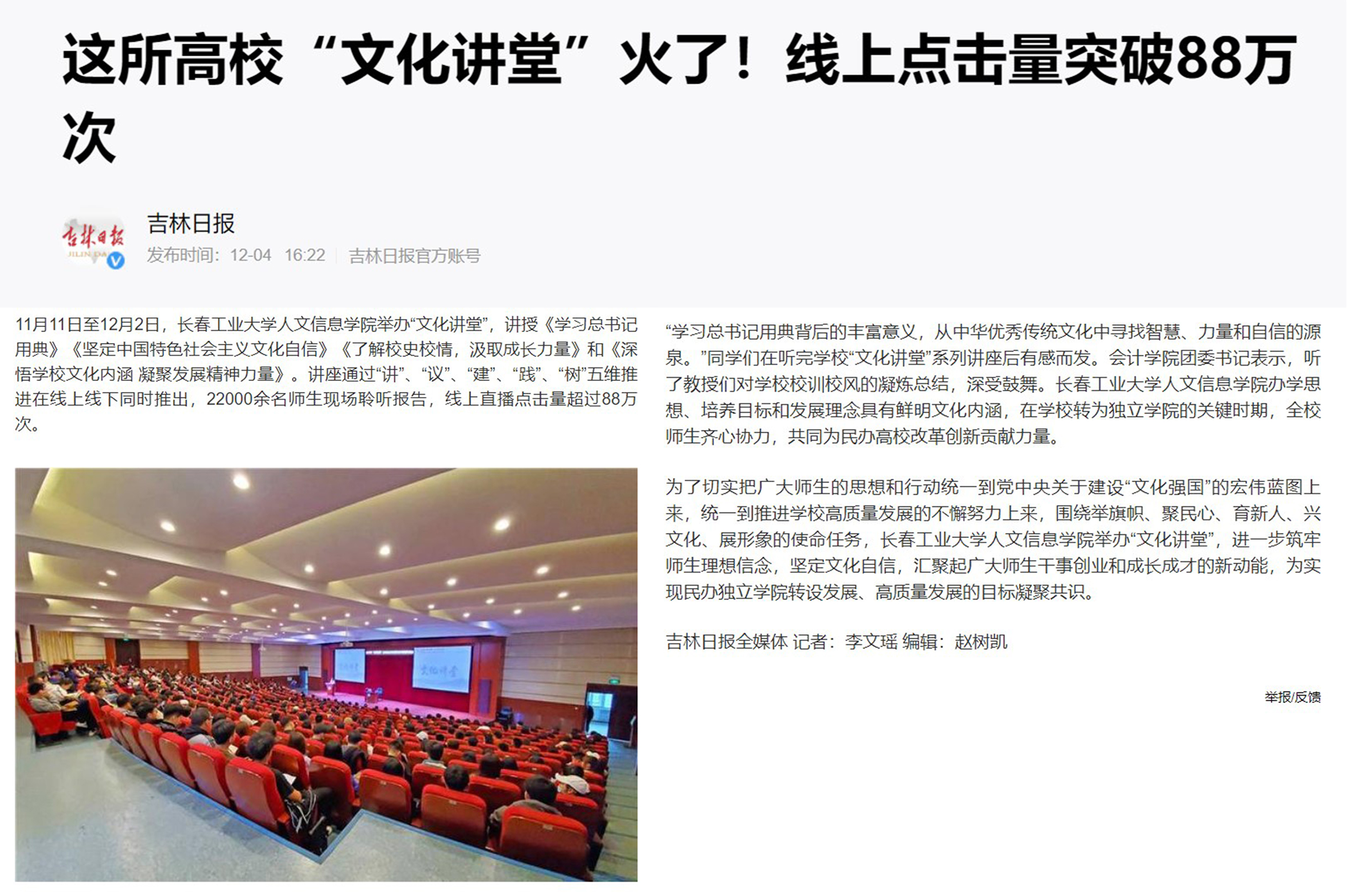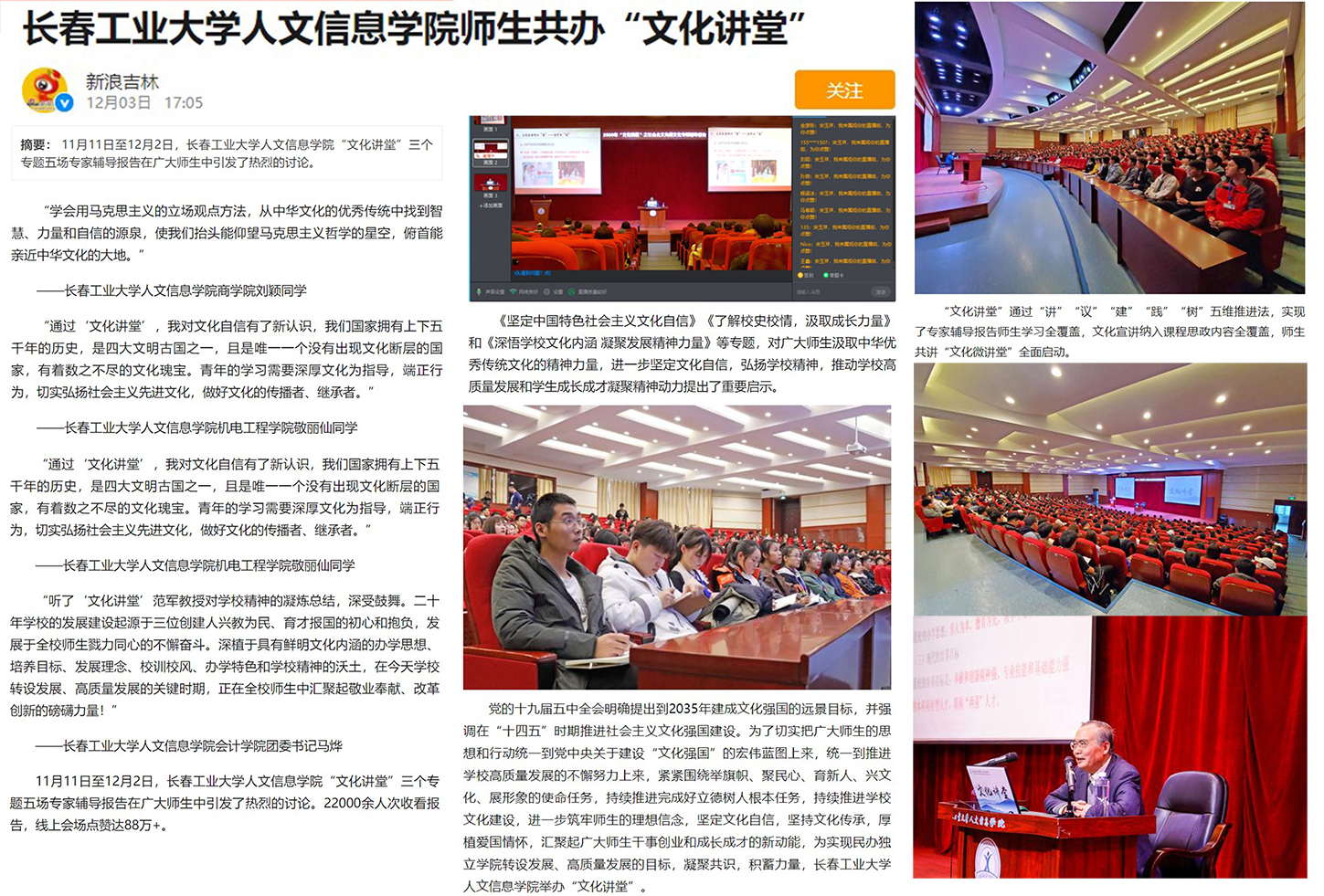 11月11日至12月2日,长春工业大学人文信息学院举办“文化讲堂”,讲授“学习习近平总书记用典”、“坚定中国特色社会主义文化自信”、“了解校史校情,汲取成长力量”和“深悟学校文化内涵 凝聚发展精神力量”。讲座通过“讲”“议”“建”“践”“树”五维推进在线上线下同时推出,22000余名师生现场聆听报告,线上直播点赞量超过88万次。